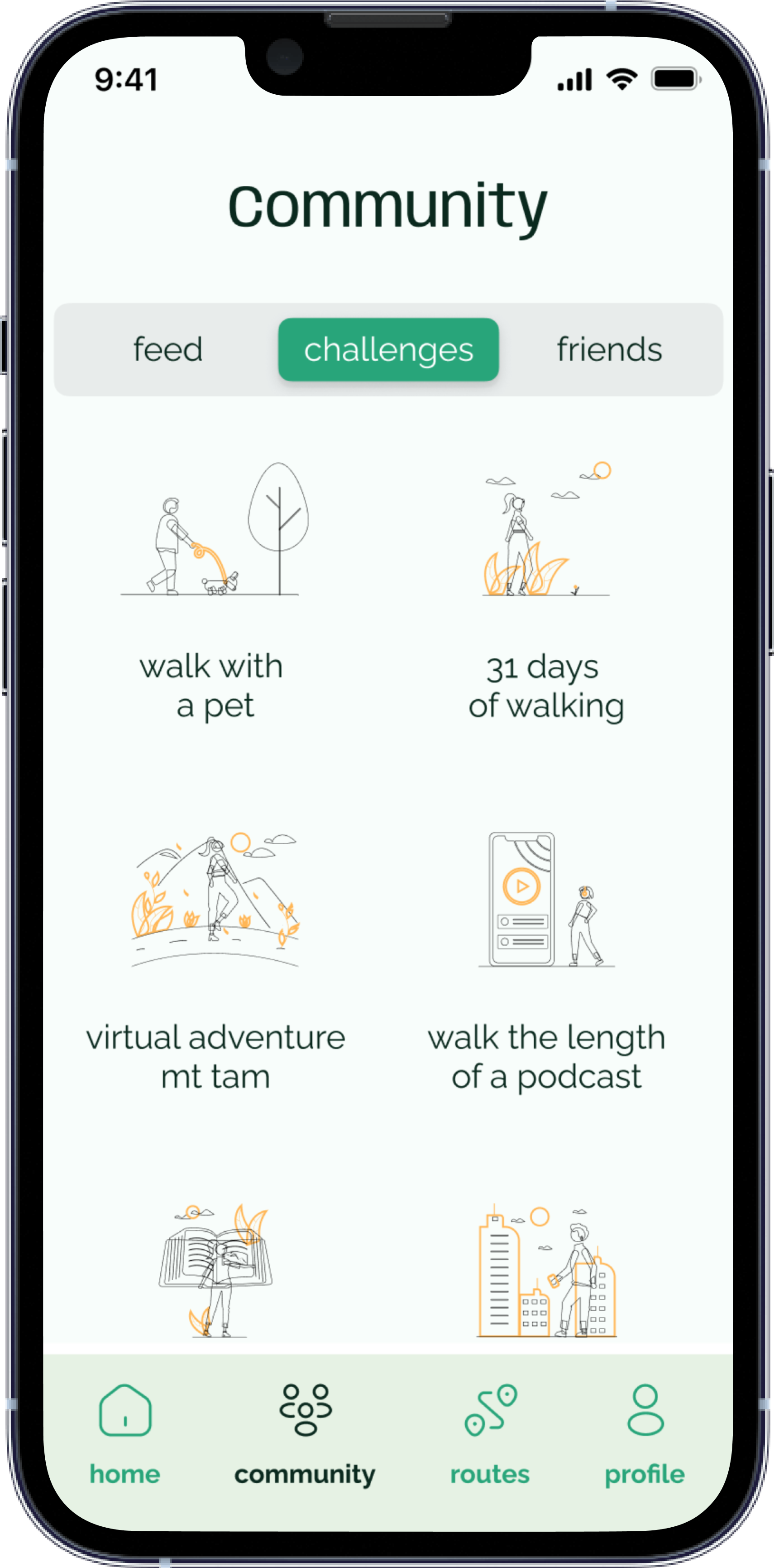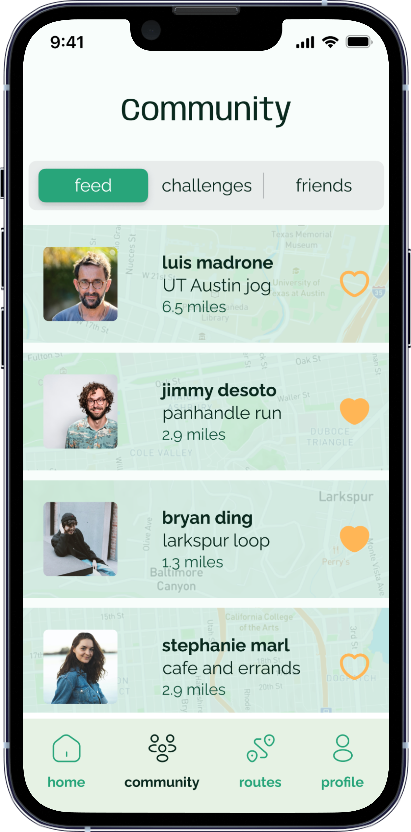 Interviewees were motivated to walk by a sense of community, especially during covid. Users can interact with their friends’ routes by liking them or even taking the same walking route. Taking beloved routes in new cities is a great way to experience the city like a local. Users can also participate in various challenges in order to motivate themselves and earn badges. The friend list displays users’ lifetime mileage and the badge they have most recently received.