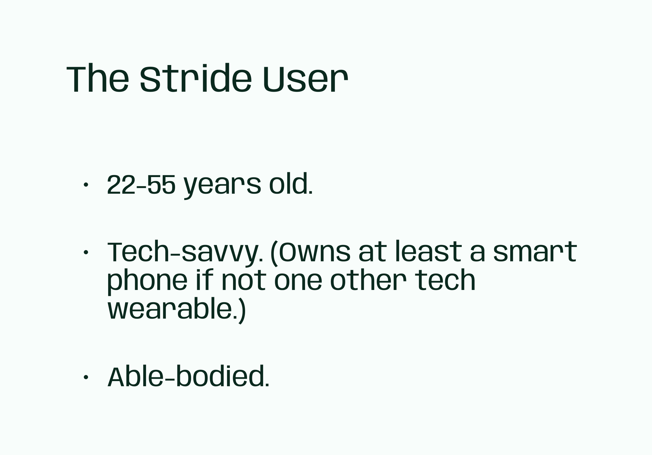 Through interviews I was able to better understand the frustrations and motivations of people who knew they should be walking more but lacked the interest in doing so. To start the process I created a breakdown of the ideal user for Stride so I would know who to recruit for interviews.