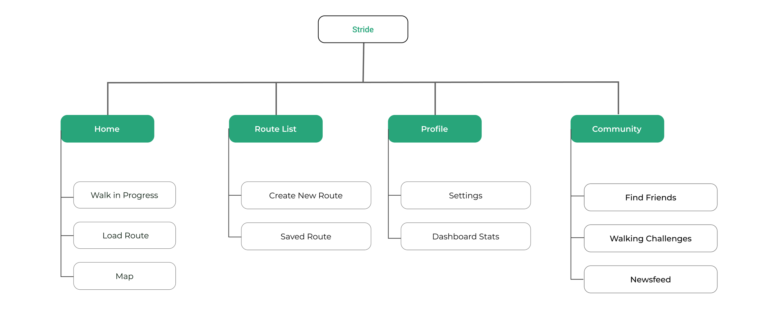Before I could start sketching anything I needed to create a map for Stride. It was important to know which screens I would need to design before I started ideating and I relied on my flows to inform the information architecture of the app.