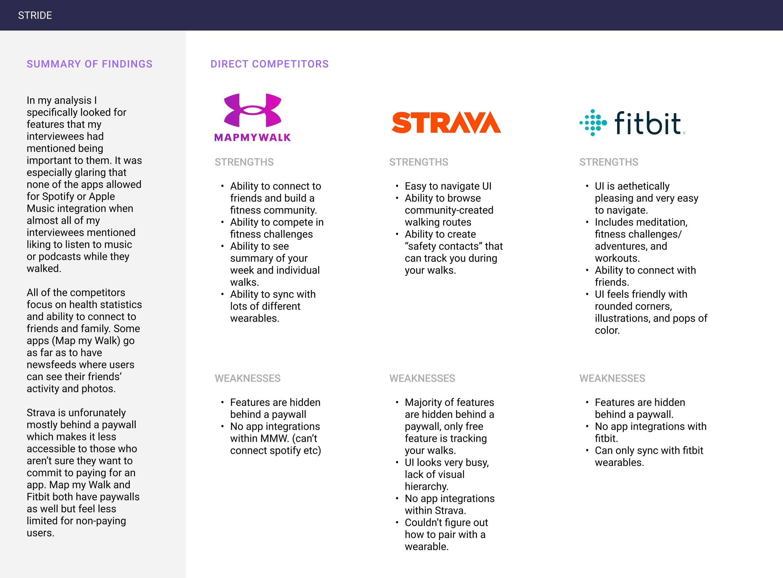 Using my affinity map and notes from user interviews I chose Map My Walk, Strava, and Fitbit to examine more closely in my competitive analysis. At first I thought I wanted to examine and compare the features of each app but I quickly realized that the discrepancies in usability were far more telling. I knew that Stride needed to be welcoming, calming and simplistic in order to overcome the user’s motivation barriers. If users struggled to understand the basic navigation of the app then it wouldn’t matter how many features I included.