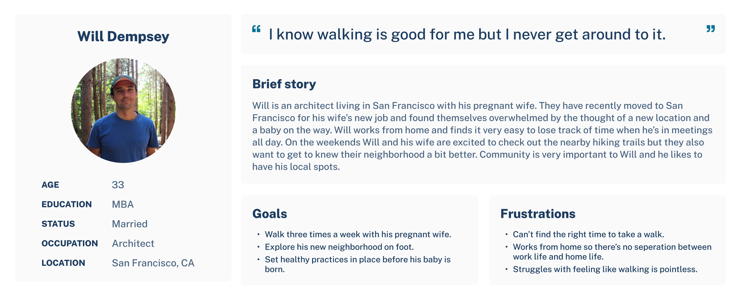 I created the persona “Will Dempsey” so I could begin to tell the user stories that would shape Stride. Will was an amalgamation of several interviewees. He fell into the category of “workaholic”, a user who worked from home everyday and struggled to find balance and time for walks in his every day life without the convenience of a commute.
